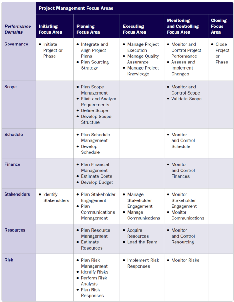 Performance domains are now directly supported by defined processes across governance, scope, schedule, finance, stakeholders, resources, and risk making them far more actionable for real projects.