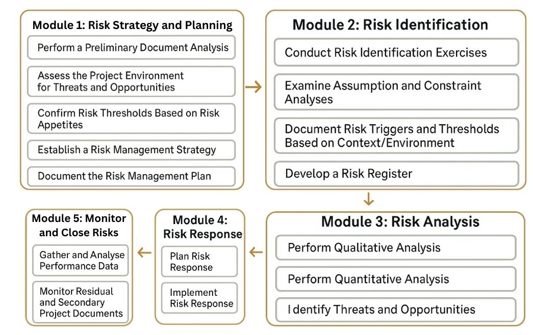 • Comprehensive Modules: Covering topics from risk strategy and planning to monitoring and closing risks.